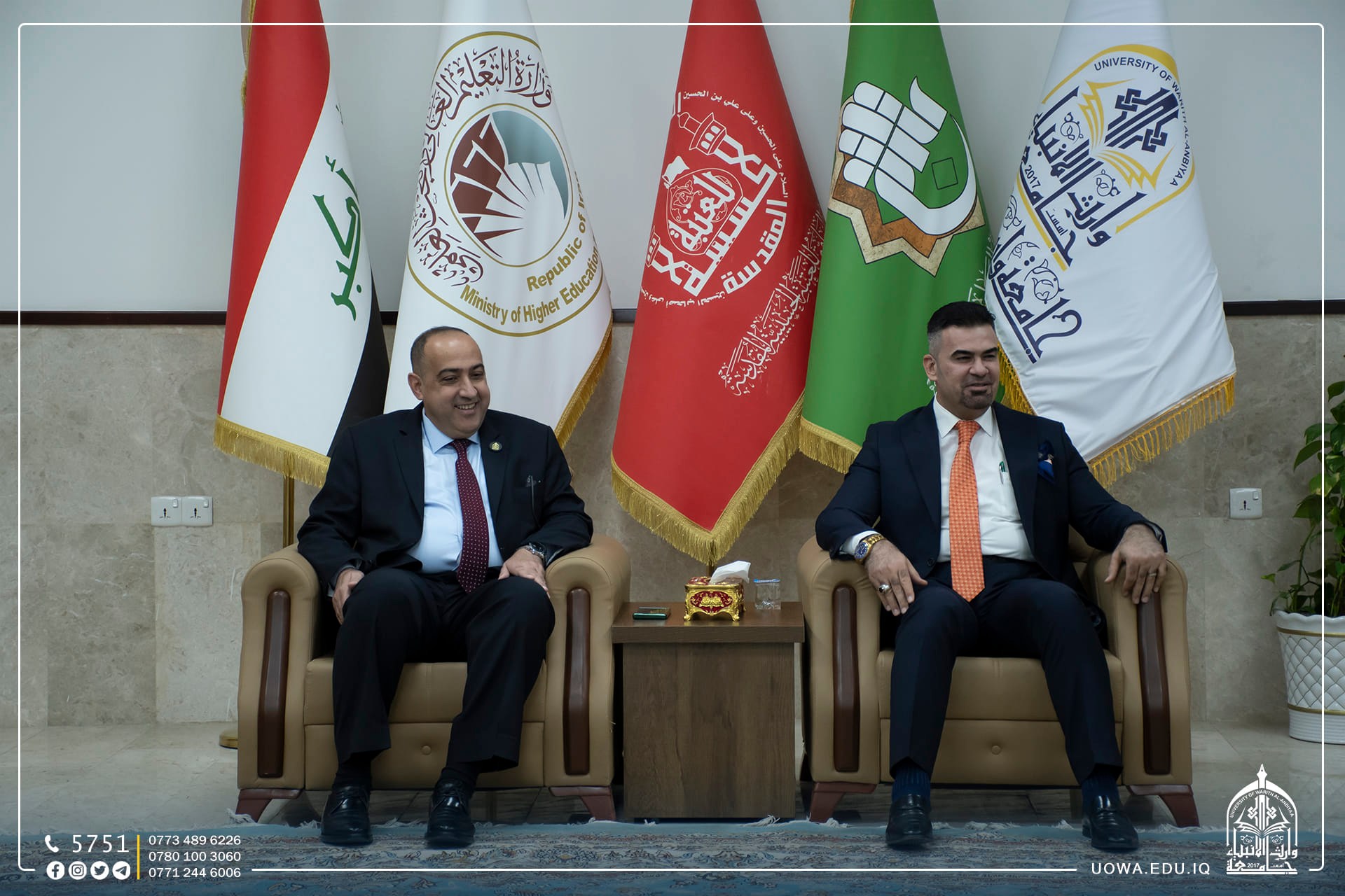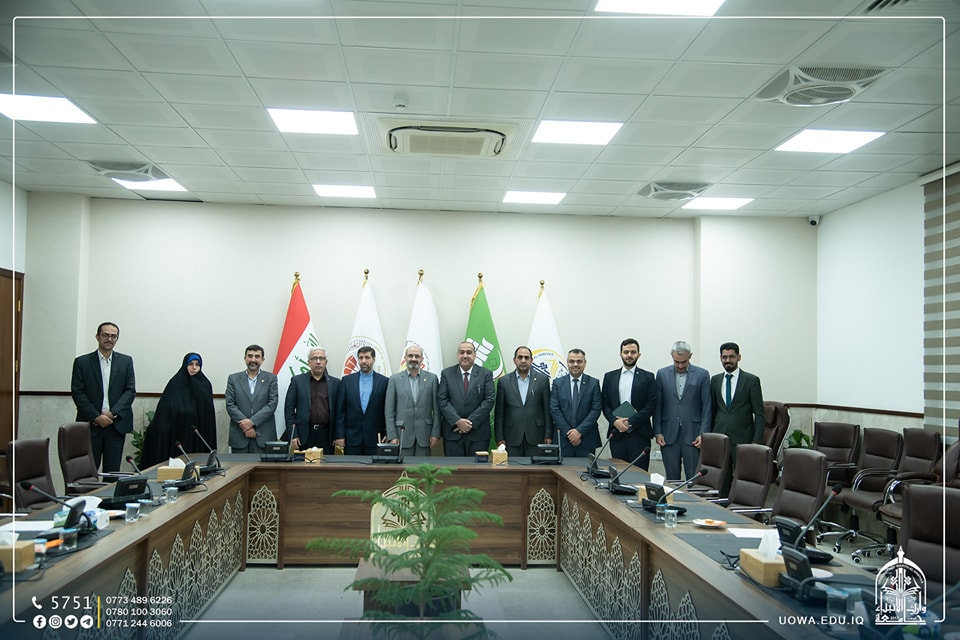In execution of the terms of the scientific agreement between University of Warith Al-Anbiyaa and the Technological University, Professor Dr. Ibrahim Al-Hayawi, the President of the University, received a delegation from the Presidency of the Technological University, led by Professor Dr. Ahmed Al-Ghaban, the University President. This visit was aimed at enhancing the scientific collaboration between the two universities and monitoring the implementation of the agreement's provisions