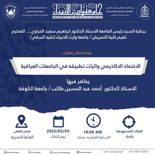 Under the patronage and presence of the University President, Professor Dr. Ibrahim Al-Hayawi, and with the sponsorship of the Dean of the College of Nursing, Dr. Mortada Al-Jubouri, the College of Nursing held a workshop titled "Academic Accreditation and its Implementation Mechanisms in Iraqi Universities." The workshop was delivered by Professor Dr. Ahmed Abdulhussain from Al-Kufa University. The workshop discussed various international academic accreditations and the methods of achieving their requirements in light of the higher education experience in Iraq.