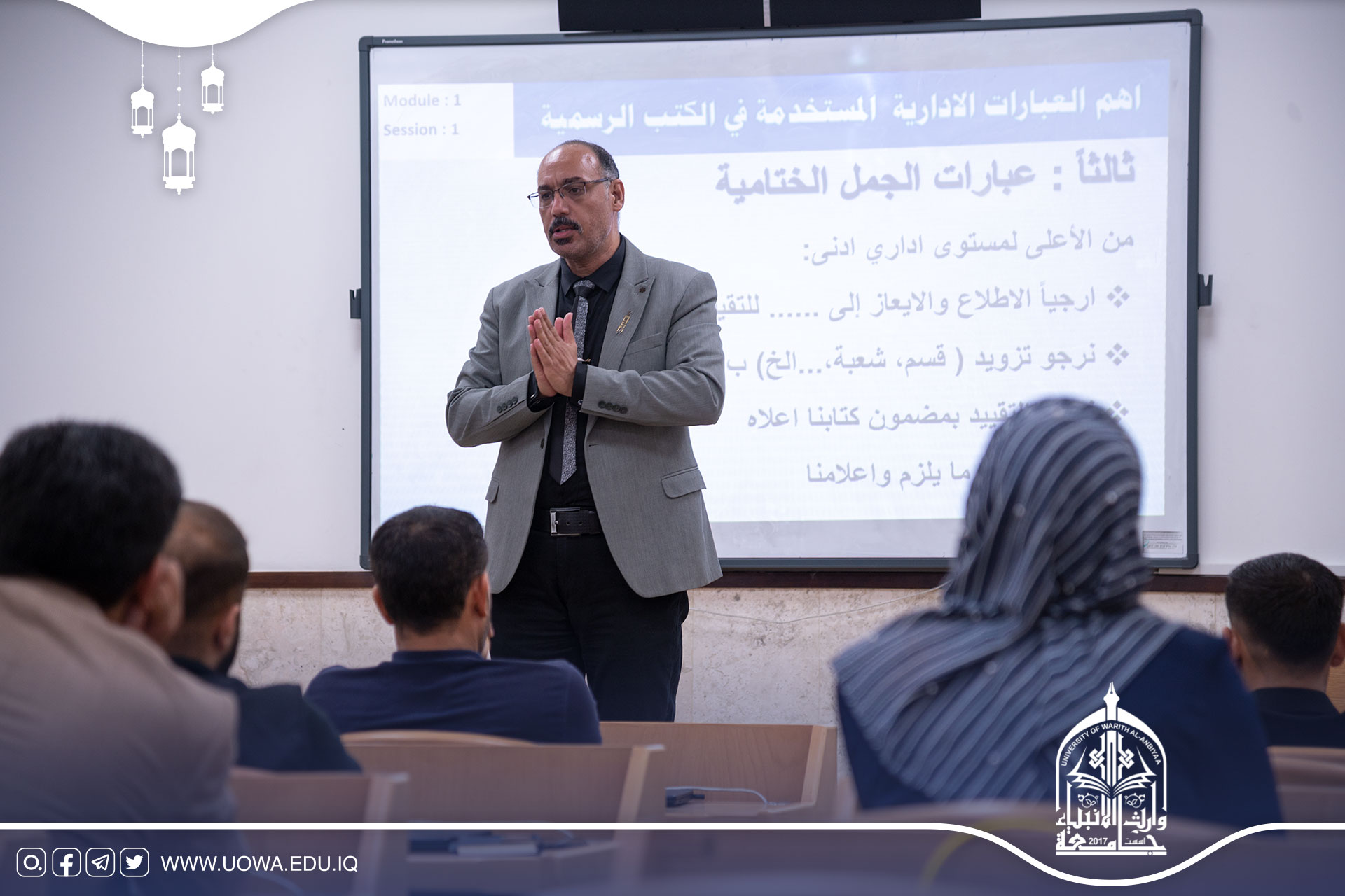 The Continuing Education Center organized a training course for department heads, section managers, and administrative staff responsible for official tasks. The course, titled "Administrative Correspondence," was delivered by the international trainer, Dr. Ahmed Al-Jabasi.